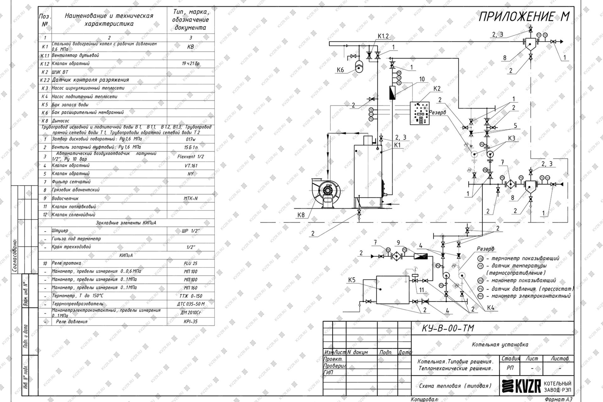 Образец тепловой схемы подключения оборудования в котельной приведен на данной схеме. При эксплуатации очень важно грамотно осуществить подключение оборудования, установить все контрольно измерительные приборы, для контроля параметров работы котельной и запорную арматуру для оперативного переключения потока теплоносителя при плановой или аварийной остановке оборудования. Данную схему можно использовать как пример для разработки под свой объект или заказать у нас разработку индивидуальной схемы для вашей котельной.