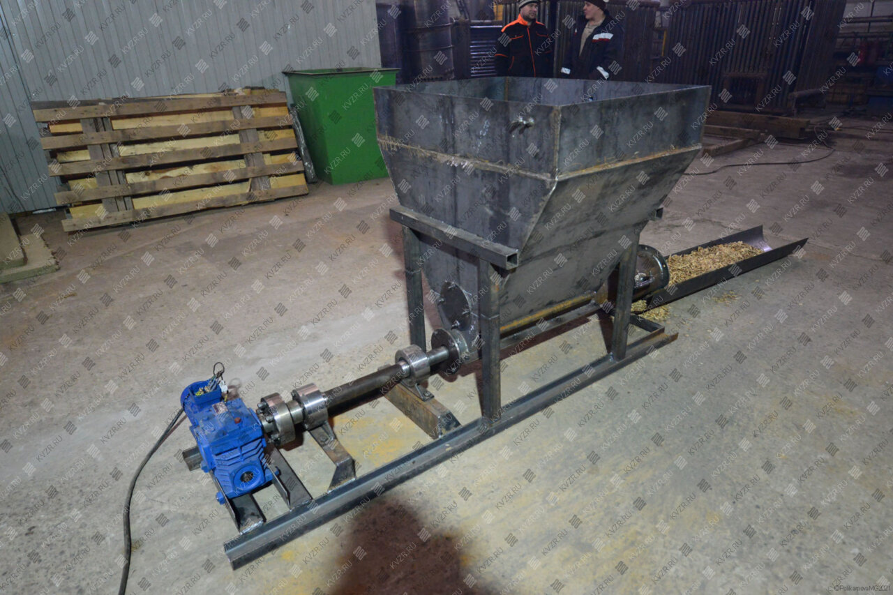 Бункер и привод питателя располагаются на общей раме. Конструкция бункера под древесное топливо и узел соединения со шнековым питателем позволяет полностью опорожнять бункер за счет питателя топлива.